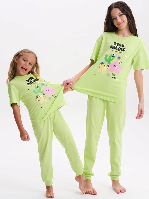 Стильная и уютная пижама актуального цвета для девочки. В составе ткани 100% хлопка — идеально для детской одежды! Модель приятна на ощупь, прекрасно пропускает воздух, позволяя коже ребёнка дышать. При этом в пижаме из хлопка ребёнку будет тепло, даже если он сбросит одеяло. Всё это обеспечивает комфортный и качественный сон. Футболка и брюки среднего объёма, плечо немного спущено, рукава широкие и свободные — в пижаме очень удобно спать. Широкая и мягкая резинка в поясе не перекручивается и не давит. Манжеты брюк и отделка горловины из эластичной рибаны — она не растягивается, ребёнку удобно надевать и снимать пижаму. Футболку украшает позитивный принт. Надписи переводятся: "исследуй новые идеи", "создай немного искусства". Хлопковый комплект идеален для сна как дома, так и в детском саду — прекрасный выбор для вашего ребёнка! Пижама с брюками подходит для круглогодичного использования. Домашний комплект — замечательный подарок дочке, внучке, сестре на любой праздник. Выбирайте нужный размер по таблице размеров на фото. Цвет товара на экране вашего устройства может отличаться от цвета изделия вживую.