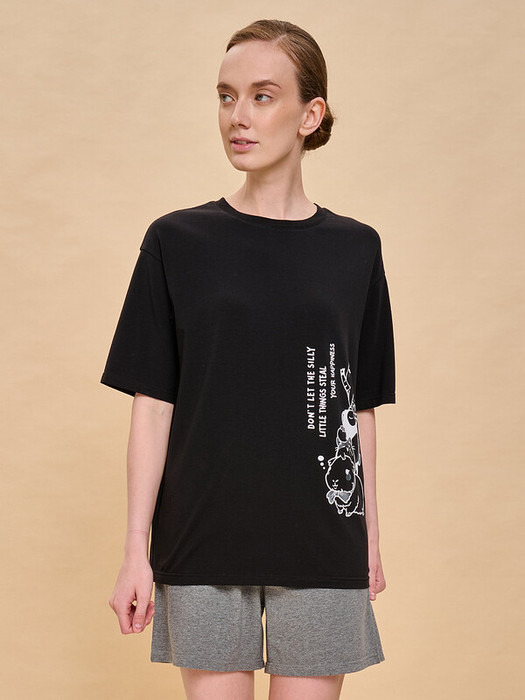 Пижама женская с шортами. В составе ткани преобладает высококачественный хлопок — комплект для сна мягкий, гипоаллергенный и хорошо пропускает воздух. В хлопковой пижаме вам будет комфортно и уютно во время сна. Эластан помогает модели надолго сохранить первоначальную форму. Футболка силуэта оверсайз, плечо спущено, рукава широкие и удлинённые — в пижаме очень удобно спать. В поясе шорт мягкая и широкая резинка — не перекручивается и не давит. Отделка горловины из эластичной рибаны — она не растягивается, пижаму удобно надевать и снимать. Хлопковая пижама украшена милым, «няшным» принтом в виде забавных зверушек с позитивным настроением, надпись переводится: «не позволяй глупым вещам воровать твоё счастье» — почувствуйте себя беззаботной девчонкой. В принте есть модный оттенок — серебритсый металлик. Пижамный костюм неприхотлив в уходе. Принт эластичный и мягкий, легко переносит частые стирки. Милая пижама подходит как для сна, так и просто для отдыха дома, пижамной вечеринки. Помните о правильном уходе за изделием: рекомендуется стирать при температуре не выше 30 °C, без предварительного замачивания, с изнанки. Это поможет сохранить качество и цвет пижамы на длительное время.