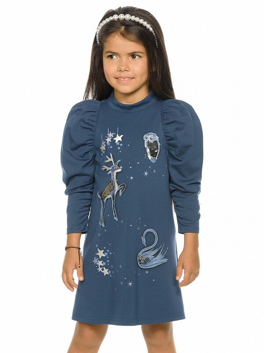 Нарядное платье, слегка расширенное к низу. Горловину украшает изящная стойка, застёжка на две пуговицы по спинке. Фишка платья в пышных рукавах, объём которых достигнут за счет густой сборки оката. Сборка рукава по внутреннему шву на эластик позволяет регулировать длину. Перед декорирован сказочным принтом с серебряным металликом и пайетками.