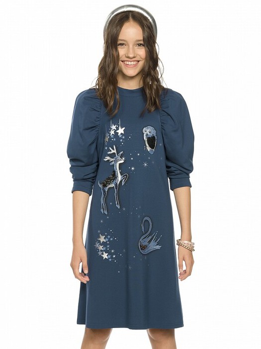 Нарядное платье, слегка расширенное к низу. Горловину украшает изящная стойка, застёжка на две пуговицы по спинке. Фишка платья в пышных рукавах, объём которых достигнут за счет густой сборки оката. Сборка рукава по внутреннему шву на эластик позволяет регулировать длину. Перед декорирован сказочным принтом с серебряным металликом и пайетками.