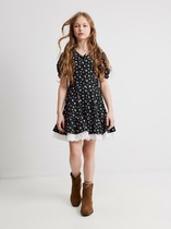 Платье расслабленного силуэта, со спущенным мягким плечом, рукав по типу рубашечного, книзу слегка расширенный. Перепад длины переда и спинки, с разрезами в боковых швах. Принт фэшн стилизация графика шрифты серебряным металликом. Перевод Инста сторис. Надпись белым Не знаю, все равно.