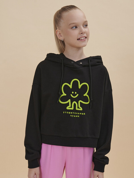 Стильное укороченное худи для девочек. Худи из футера трендового оверсайз-силуэта со спущенным плечом подарит ребёнку комфорт и не будет стеснять его движений. Худи с капюшоном с двумя швами, что обеспечивает анатомически правильную форму и комфортную посадку по голове. Худи однотонное, с принтом, по низу изделия и  рукавов манжета из рибаны. За толстовкой легко ухаживать. В составе ткани преобладает высококачественный хлопок — худи мягкое и отлично пропускает воздух, позволяя коже ребёнка дышать. Благодаря эластану изделие сохраняет великолепную форму в течение долгого времени. Джемпер выполнен в двух актуальных цветах: зеленом и черном. Его легко сочетать с любыми брюками, легинсами, джинсами. В линейке представлены следующие размеры: 1 (86); 2 (92); 3 (98); 4 (104); 5 (110); 6 (116); 7 (122); 8 (128); 9 (134); 10 (140); 11 (146). Худи детское подходит девочкам дошкольного возраста, младшим школьницам и девочкам-подросткам. Модель идеальна для детского сада, прогулок, отдыха, её можно носить дома. Худи без начёса оверсайз подходит для круглогодичного применения: летом, осенью, зимой, весной и демисезон. Это замечательный подарок дочери, внучке или сестре на День рождения и любой другой праздник. Выбирайте нужный размер по таблице размеров на фото. Цвет товара на экране вашего устройства может отличаться от цвета изделия вживую.