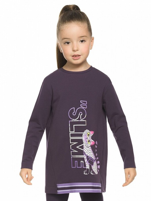 Оверсайз туника для девочек из футера со спущенным плечом. Боковые швы переведены на перед создавая эффект силуэта бочонок . По низу настрочена декоративная эластичная тесьма. Фольгированный голографический принт с неоном.