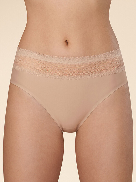Женские трусы-слипы с высокой посадкой. Изготовлены по бесшовной технологии с минимум швов. Кромки по ноге и по талии подогнуты и приклеены, хлопковая приклеенная ластовица.  Нежное геометричное кружево по линии талии высотой 5 см – не передавливает тело и не натирает кожу.  Модель оценят те, кто ищет незаметное и невесомое белье на каждый день или особого случая.