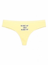 Женские трусики стринги. Низкая посадка. По талии и по ноге обработка эластиком. По спинке кружево. Прочный принт. Перевод Просыпайся и нанеси макияж. Продольный шов по спинке.