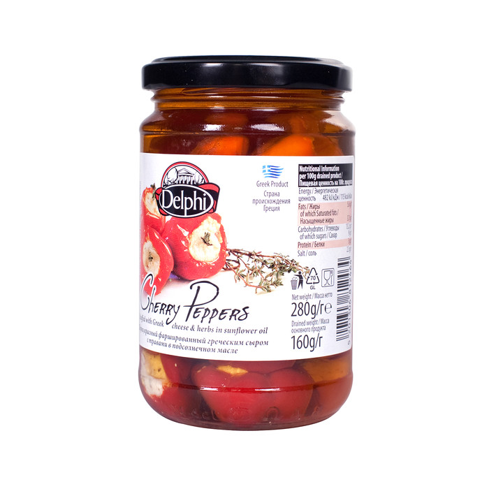 Cherry pepper - это разновидность красного перца с отличительным сладким вкусом. Его маленькая круглая форма делает его идеальным в качестве закуски. Контрастируя при фаршировке с соленой Фетой, сладкий Cherry pepper становится поистине деликатесом. Это продукт для гурманов, прекрасно сочетающийся с остальной частью овощной консервации Delphi.