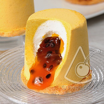 Нежнейшее суфле из манго с сердцевиной из белого суфле из свежих сливок с ароматной начинкой из маракуий с косточками на корже из кокосовой стружки