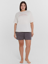 Комплект сосотоит из майки и шорт. Шорты полуприлегающие, короткие, на поясе, с фигурным низом. Майка прилегающего силуэта, с округлой горловиной, с удлиненной спинкой. В верхней части спинки расположена кокетка из отделочного ролотна. Горловина, проймы обработаны бейкой из отделочного полотна, а низ шорт - из основного полотна.