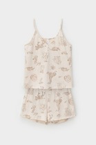 Пижама женская из гладкокрашеного трикотажного вискозного полотна, состоящая из майки и брюк.