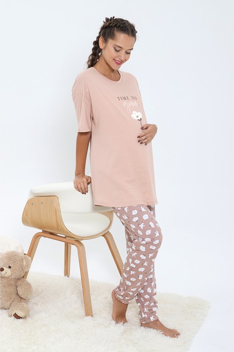 Пижама женская , состоящая из футболки и брюк. Футболка классического покроя, с короткими втачными рукавами, горловиной овальной формы, обработанной втачной планкой, фигурной линией низа и принтом в центре переда, выполненным методом шелкографии. Брюки - длинные, с эластичной тесьмой верхнему и нижним срезам.