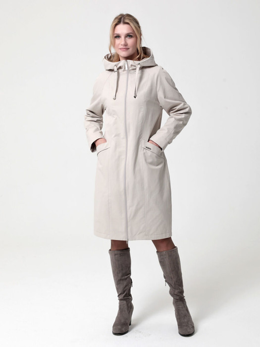 Укороченный плащ  прямого силуэта с рукавами покроя реглан и застежкой на двухзамковую молнию, позволяющую регулировать ширину шага, подходит для девушек и женщин разного возраста. Воротник - стойка, переходящая в капюшон. Вместительные карманы удобно расположены между рельефных швов. Есть внутренний кармашек на молнии.  Силуэт плаща можно менять с помощью затяжек по линии талии (со стороны спинки) и по линии низа. Подкладка в изделии выполнена из ткани в мелкую полоску. Этот весенний плащ из хлопкосодержащей ткани с водоотталкивающей пропиткой хорошо садится на любую фигуру. Добавьте яркости в аксессуарах, и Ваша весна будет комфортной и стильной!