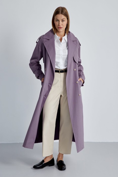 Классический двубортный кардиган прямого силуэта выполнен из хлопковой ткани. Рукава длинные. По низу рукавов хлястики с петлей и пуговицей. По бокам функциональные карманы. По переду с левой части изделия отлетная кокетка. На плечах хлястики с петлей и пуговицей (погоны). Нагрудная вытачка. По спинке отлетная кокетка. Средний шов заканчивается шлицей. Плащ со съемным поясом. Пояс в комплекте. Воротник классический с лацканами. Изделие на подкладке. Плащ отлично подойдет для ранней весны и для осени. Благодаря классическому крою он будет служить и радовать вас многие годы. Длина  по спинке - 116 см. Длина рукава - 62 см
