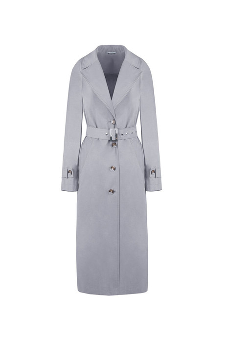 Плащ женский, однобортный, длиной ниже колена, на подкладке. Застежка на петли и пуговицы. Карман листочка. По среднему шву спинки шлица. Рукав реглан длинный, двухшовный с пристегивающейся на петлю и пуговицу патой. Воротник и лацкана отложные. В комплекте съемный пояс с пряжкой и люверсами.