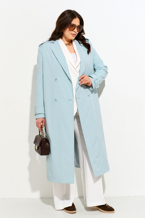 Женский демисезонный двубортный плащ свободного силуэта на подкладке выполнен из плащевой ткани с водоотталкивающим эффектом; в боковых швах карманы; рукава втачные, по низу которых вставлена декоративная пата; по плечевым швам погоны; застежка по переду на петли и пуговицы; по спинке высокая шлица. Плащ полностью соотвествует заявленному размеру.