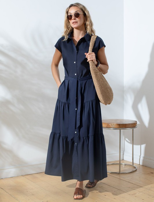 Состав: 77%Хлопок 20%ПЭ 3%ПУ Плотность: 96 Г/м2Платье А-силуэта с поясом темно-синего цвета выполнено из легкого хлопкового поплина плотностью 96 Г/м2. Воздушное платье на пуговицах по всей длине с пышной юбкой-воланами в стиле бохо отличный вариант для теплой и жаркой погоды. Модель обладает красивым ярусным кроем, который придает образу женственность и элегантность. Отложной воротничок и короткий рукав создают стильный акцент, подходящий для повседневного ношения и различных ситуаций. Талия подчеркнута поясом, который легко регулируется и подчеркивает силуэт, придавая особый шарм и аккуратность образу. Натуральный состав ткани обладает высокой воздухопроницаемостью, а также способностью поглощать и отдавать влагу. В повседневном платье будет очень комфортно, благодаря правильной регуляции температуры тела. Такая модель подходит на маленький и высокий рост, а так же на любую фигуру, позволяя подчеркнуть достоинства и скрыть возможные недостатки. Это длинное платье отлично подойдет тем, кто ценит удобство и утонченность в одежде из качественной вискозы и хлопка. Красивое легкое платье прекрасно подходит для динамичного рабочего дня, городских прогулок или торжественных мероприятий, его легко адаптировать под разные ситуации и стили.