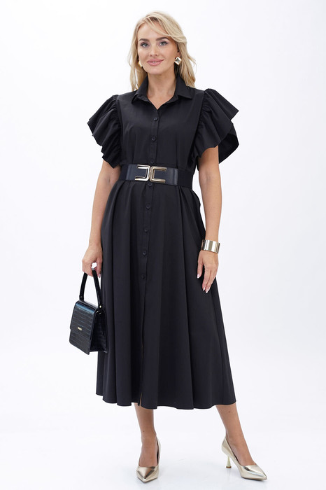 Платье женское полуприлегающего силуэта вверху с расширением книзу, отрезное по линии талии, в дополнении ремень. С застёжкой по притачной планке на петли, пуговицы. С короткими рукавами «крылышко» собраны на сборку. Воротник стояче-отложной на отрезной стойке, застёгивающейся на петлю, пуговицу.