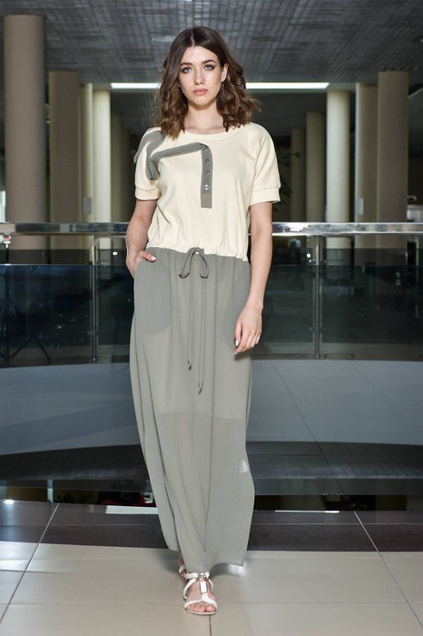 Летнее платье с приятным трикотажным верхом и летящим шифоновым низом.На полочке дизайнерский декор из шифона. На талии удобная регулируемая кулиска со шнурками. По боковым швам есть карманы и разрезы. Длина изделия на рост 164-134 см, на рост 170-141 см.