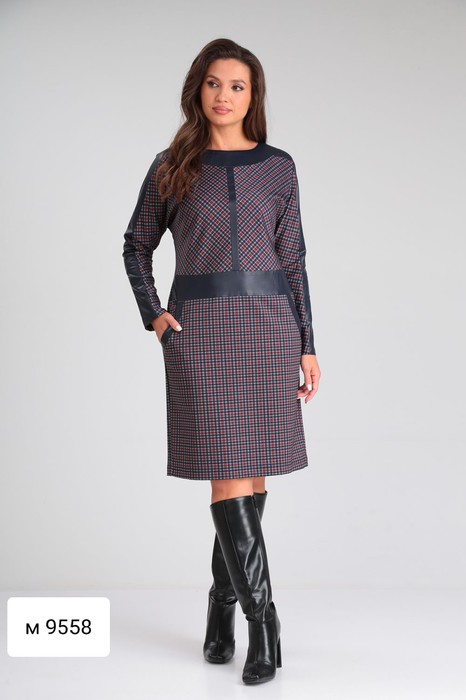 Платье женское полуприталенного силуэта с элементами отделки кожи . Отрезное по линии талии , с карманами. Рукав летучая мышь. В боковом шве тесьма-молния.