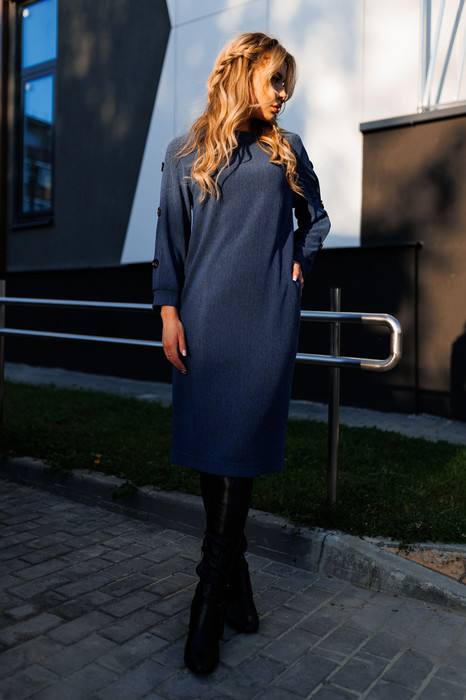 Трикотажное женское платье прямого силуэта, по спинке тесьма -молния.по переду карманы. Рукав со складкой и декоративными пуговицами, на манжете.