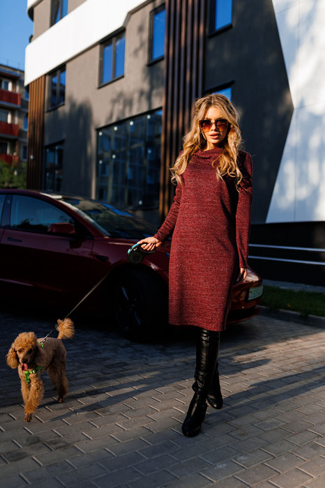 Трикотажное платье средней длины, с красивой горловинкой - стойкой.   Особенно красивый трикотаж - немного меланжевый и имеет еле-заметную  тончайшую люриксовую ниточку, При чем, блеск настолько мягко проигрывается, что очень мало заметен, но в то же сремя придает богатства и эффектого вида изделию. По этому платье прекрасно подойдет для любого случая в жизни.
