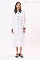 Натуральное платье с дизайнерской вышивкой у горловины. Спика имеет средний шов, застежку на тесьму-молнию, талиевые выточки и разрезик.