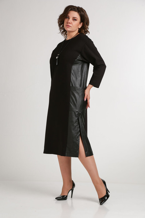 Трикотажное женское платье подойдёт как для офиса,так  и для вечернего образа. Вставки из "экокожи " при корректном выборе размера визуально удлиняют фигуру и стройнят. По переду платья два кармана и разрезы, по спинке застёжка-молния. Бижутерия в комплекте( меняется в зависимости от наличия!!!!)