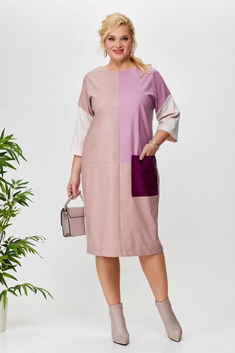 Платье женское из двух видов ткани (спинка и рукав - трикотажное плотно, полочка-эко-кожа). Платье прямого силуэта длиной за колено. Перед разрезной (из двух цветов кожи) с накладным карманом. Спинка со средним швом, застежка на потайную молнию, в низу разрез, горловина овальной формы. Рукав со спущенным плечом. Длина платья: (50-52)-100 см., (54-56)-104см. Длина рукава: (50-56)-28 см.