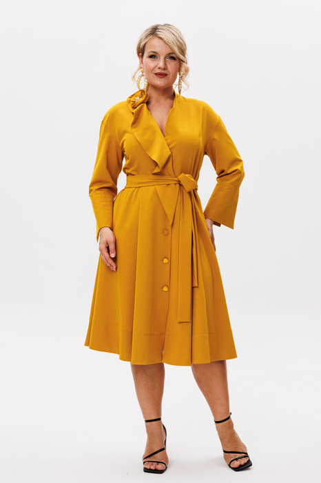 Элегантное женское платье  необычного кроя станет изюминкой вашего гардероба. Платье  прилегающего силуэта, отрезное по линии талии, по передеу застежка на петли и пуговицы, в верхней части платья по полочке прилегание создается за счет талиевых выточек, по спинке - за счет резинки по линии талии.  Юбка-полусолнце с односторонними  складками, по бокам карманы. Плечо спущенное, рукав укороченный, на высокой  манжете на одну пуговицу. Горловина по полочке выполненна в виде цельнокроеной стойки, переходящей в отрезную по спинке. В качестве декора по краю борта идет жабо, переходящее в цветок.  В комплекте съемный пояс в тон платья. ВНИМАНИЕ! брошь в комплект не входит. Длина по спинке:-111см. Длина рукава с манжетой-51см.