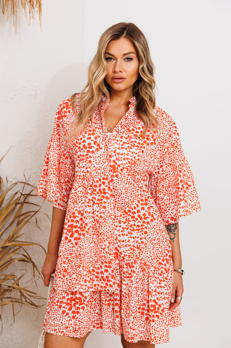 Оригинальное хлопковое платье необычного кроя, легкое и невесомое - идеально в жару . Платье оверсайз прямого силуэта из тонкой хлопковой ткани со спущенным плечом. Рукав со сборкой. По полочке идет асимметричный подрез с воланом, застежка на петли и пуговицы. По низу платья -волан. По горловине -стойка.