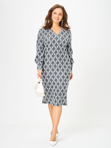 Платье женское трапециевидного силуэта, из трикотажного полотна. Платье по переду цельное, расширенное к низу, по боковым швам карманы полуовальной формы. Спинка платья стачная, расширенная к низу. Рукав-длиной 3/4, втачной, одношовный. Горловина овальной формы. Длина изделия: (50-54)-96см.(56-60)-103 см.,