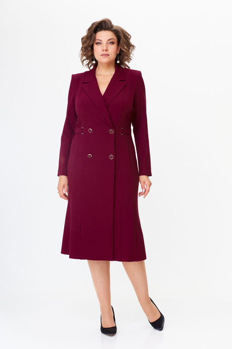 Платье полуприлегающего силуэта, выполнено из однотонной ткани. Платье длиной за колено, с небольшим расклешением по низу. Полочка платья с двубортной застежкой на пуговицы.  Полочка с вертикальными рельефами. В шве притачивания бочка к средней части полочки обработан карман. Горловина V-образной формы, с отложными лацканами и воротником пиджачного типа. В области талии выполнен декоративный элемент из хлястиков и металлических рамок.