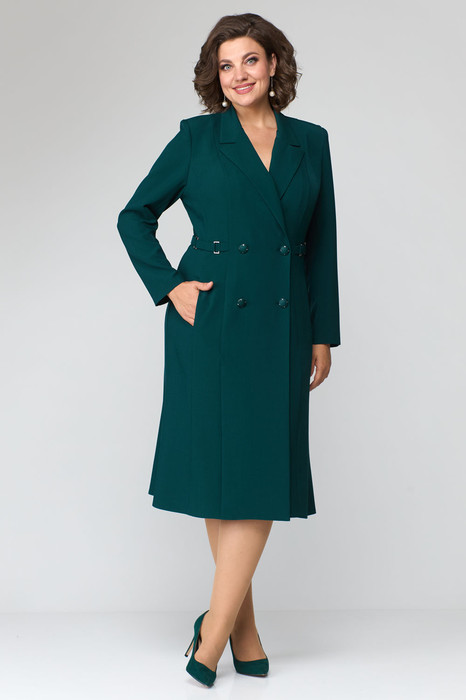 Платье полуприлегающего силуэта, выполнено из однотонной ткани. Платье длиной за колено, с небольшим расклешением по низу. Полочка платья с двубортной застежкой на пуговицы. Полочка с вертикальными рельефами. В шве притачивания бочка к средней части полочки обработан карман. Горловина V-образной формы, с отложными лацканами и воротником пиджачного типа. В области талии выполнен декоративный элемент из хлястиков и металлических рамок.