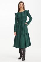 Юбка платья формы колокол, по передней половине обработаны наклонные карманы.