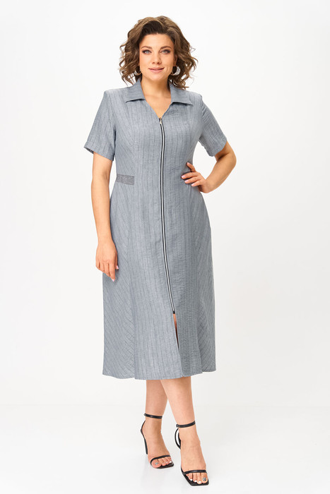 Полочка платья с центральной застежкой на молнию и вертикальными рельефами. Горловина V-образной формы с отложным воротником. Спинка с вертикальными рельефами. В области талии от рельефа спинки до рельефа полки обработан