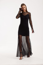 Полочка платья с центральным швом, в верхней части которого выполнена оригинальная застежка на петли и пуговицы, в нижней части центрального шва полочки обработана шлица. Полочка с нагрудными вытачками. Горловина круглой формы с воротником рубашечного типа. Спинка со средним швом.  Рукав втачной, одношовный, длинный, по низу со складкой и притачной манжетой. Манжета с разрезом по низу и декором из пуговиц.