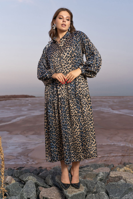 Платье силуэта транеция в стиле "бохо", воротник со стойкой, лиф застёгивается на петли пуговицы. Платье с притачными двумя воланами, с боковыми карманами. Рукава со сборкой по низу, с притачной манжетой застёгивающейся на петлю и пуговицу.