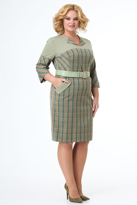 Платье прямого силуэта, по переду центральный шов, рельефы, переходящие в бочок, в рельефах рабочие карманы с притачным клапаном; вырез горловины круглый с разрезом, которые обработаны притачными деталями. Пройма с притачной фигурной деталью. Спинка со средним швом и талевыми вытачками. Модель с подчёркивающим фигуру кроем.