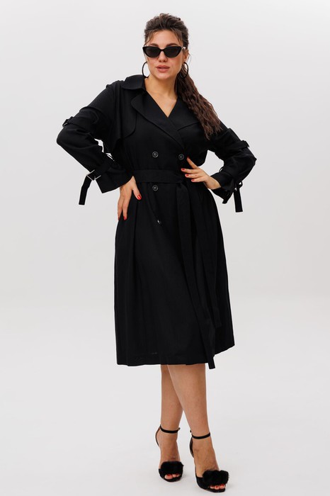Двубортная застёжка на пуговицы, лацканы и отложной воротник на стойке добавляют ноту английской сдержанности, а свободные втачные рукава с патами и карманы вносят функциональность и динамику. Завязывающийся пояс мягко обозначает талию, позволяя играть с пропорциями.