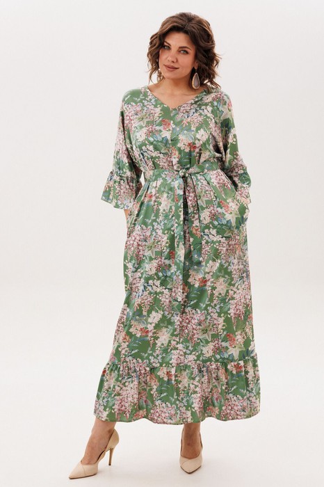 Элегантный V-образный вырез с шнуровкой на спинке добавляет образу женственности и утонченности, открывая небольшой намек на спину и создавая изысканный силуэт. Цельнокроенные рукава с игривыми воланами и притачной волан по низу придают нарядность и динамику, словно платье танцует вместе с вами. Съемный пояс дает возможность менять акценты, подчеркивая талию или оставляя образ свободным, а аккуратные функциональные карманы добавляют практичности без ущерба для эстетики.