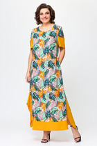 Платье прямого силуэта, по переду центральный шов, рельефы, переходящие в бочок, в рельефах рабочие карманы с притачным клапаном; вырез горловины круглый с разрезом, которые обработаны притачными деталями. Пройма с притачной фигурной деталью. Спинка со средним швом и талевыми вытачками. Модель с подчёркивающим фигуру кроем.