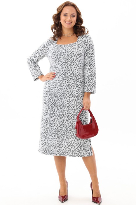 Платье прямого силуэта длиной миди. Горловина с вырезом "каре". По переду платья нагрудные вытачки. В боковых швах обработаны разрезы. Рукав втачной прямой длиной 7/8.