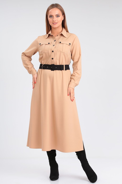 Лаконичное женское платье выручит свою обладательницу в любой ситуации. Благодаря своей универсальности платье отлично подойдет для любого мероприятия или повода: на деловой или дружеской встрече, в офисе или кафе. Платье полуприлегающего силуэта, расклешенное книзу. Воротник рубашечного типа на притачной стойке. Платье отрезное по линии талии, со шлевками для пояса. Полочка с центральной застежкой на притачных планках на контрастные кнопки, нагрудными вытачками и накладными карманами со складкой и клапаном. В боковых швах юбки планки с застежкой на контрастные кнопки и разрезы. Рукав втачной длинный, понизу с притачной манжетой с застежкой на кнопку. В комплекте к платью прилагается съемный пояс.