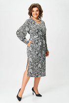 Платье из костюмно-плательной ткани приталенного силуэта длиной чуть ниже колена. Вырез горловины квадратной формы - каре. Отрезное по линии талии. Перед и спинка с рельефами. По спинке средний шов, в котором вставлена потайная молния, внизу разрез. Рукав втачной широкий длинный, по окату собран на резинку. Длинный рукав легко превратить в три четверти с помощью резинки, вставленной по низу рукава.