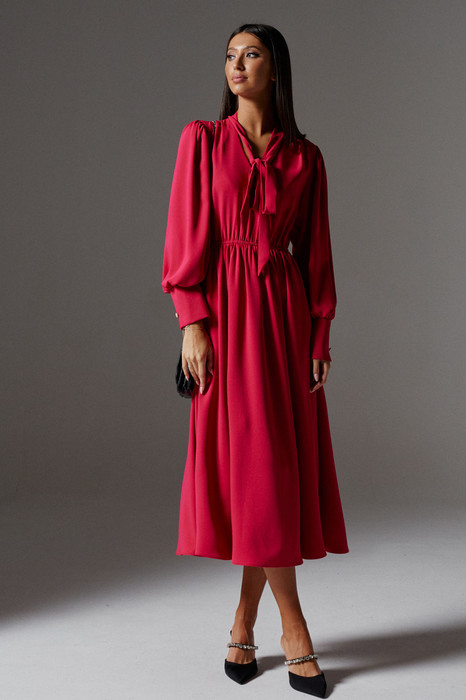 Платье полуприлегающего силуэта выполнено из полотна ягодного оттенка. Легкое, воздушное платье отлично подойдет на мероприятие, для встреч, прогулок.Характеристики: отрезное по линии талии, отрез на резинке, V образный вырез горловины, горловина обработана лентой завязывающаяся на бант, по линии плеча изящные складки, рукав втачной со сборкой по окату, по низу рукава широкая манжета с разрезом по низу и декоративной пуговичкой, низ изделия свободного кроя на подкладке. Длина изделия 120 см, длина рукава 64 см.