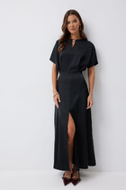 Платье полуприлегающего силуэта выполнено из красного полотна с цветочным принтом. Характеристики: полуприлегающий силуэт, подкладка, отрезное, отрез на резинке, застежка петли пуговички по центру изделия, пуговички декорированы тканью основного изделия. Горловина V образный вырез, горловина украшена воланом по периметру. Рукав втачной, по низу рукава волан. Низ изделия выполнен двумя ярусами. Длина по спинке 82 см, длина рукава 65 см.