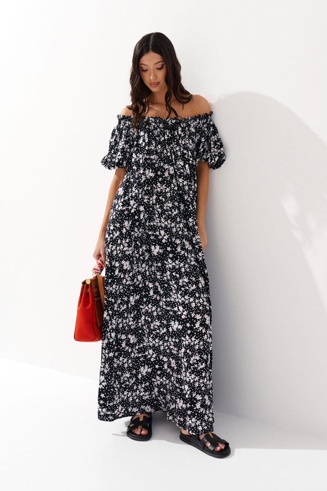 Летнее платье с полуоткрытыми плечами выполнено из черного полотна с контрастным цветочном принтом. Характеристики: свободный крой, А образный силуэт, горловина по передней части изделия и по спинке на резинке со сборкой, рукав свободного кроя, низ рукава на резинке. Длина по спинке 132 см.