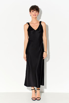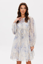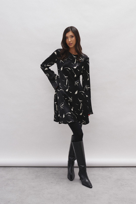 Миниатюрное платье полуприлегающего силуэта выполнено из плательной ткани с минималистическим принтом. Характеристики: полуприлегающий силуэт, овальная горловина, рукав втачной, застежка потайная тесьма молния в среднем шве заднего полотна изделия, спинка отрезная. Длина по спинке 86 см длина рукава 67 см.