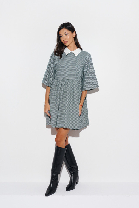 Платье свободного кроя с акцентным съёмным воротником выполнено из ткани с зеленным оттенком с геометрическим мелким принтом.Характеристики: свободный крой, подкладка, отрезное, горловина овальная, в комплекте съёмный воротник белого цвета, рукав втачной с разведением, застёжка петля пуговичка по спинке изделия. Длина платья 83 , длина рукава 36 см.