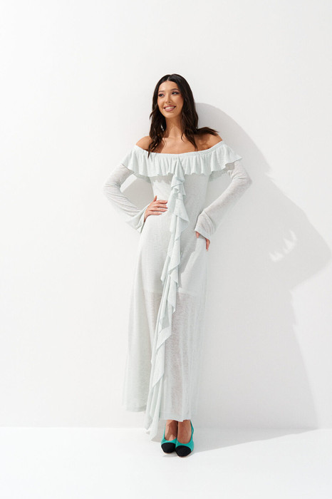 Платье полуприлегающего силуэта выполнено из полупрозрачной трикотажной ткани нежно-мятного цвета . Характеристики: короткая подкладка, открытые плечи , верх изделия на резинке, по верху изделия волан переходищий на спинку, по передней части изделия декоративная деталь выполнена из ткани основного изделия, рукав втачной. Длина по спинке 124 см, длина рукава 62 см.