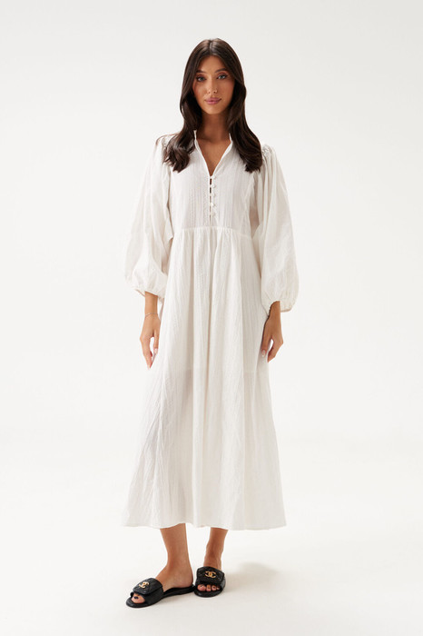 Платье выполнено из хлопкового полотна белого цвета. Характеристики: воротник-стойка, застежка центральная на пуговицы, рукав втачной "летучая мышь" на резинке , отрезное по поясу, юбка-трапеция, на подкладке. Длина изделия по спинке 128см, длина рукава 55см.